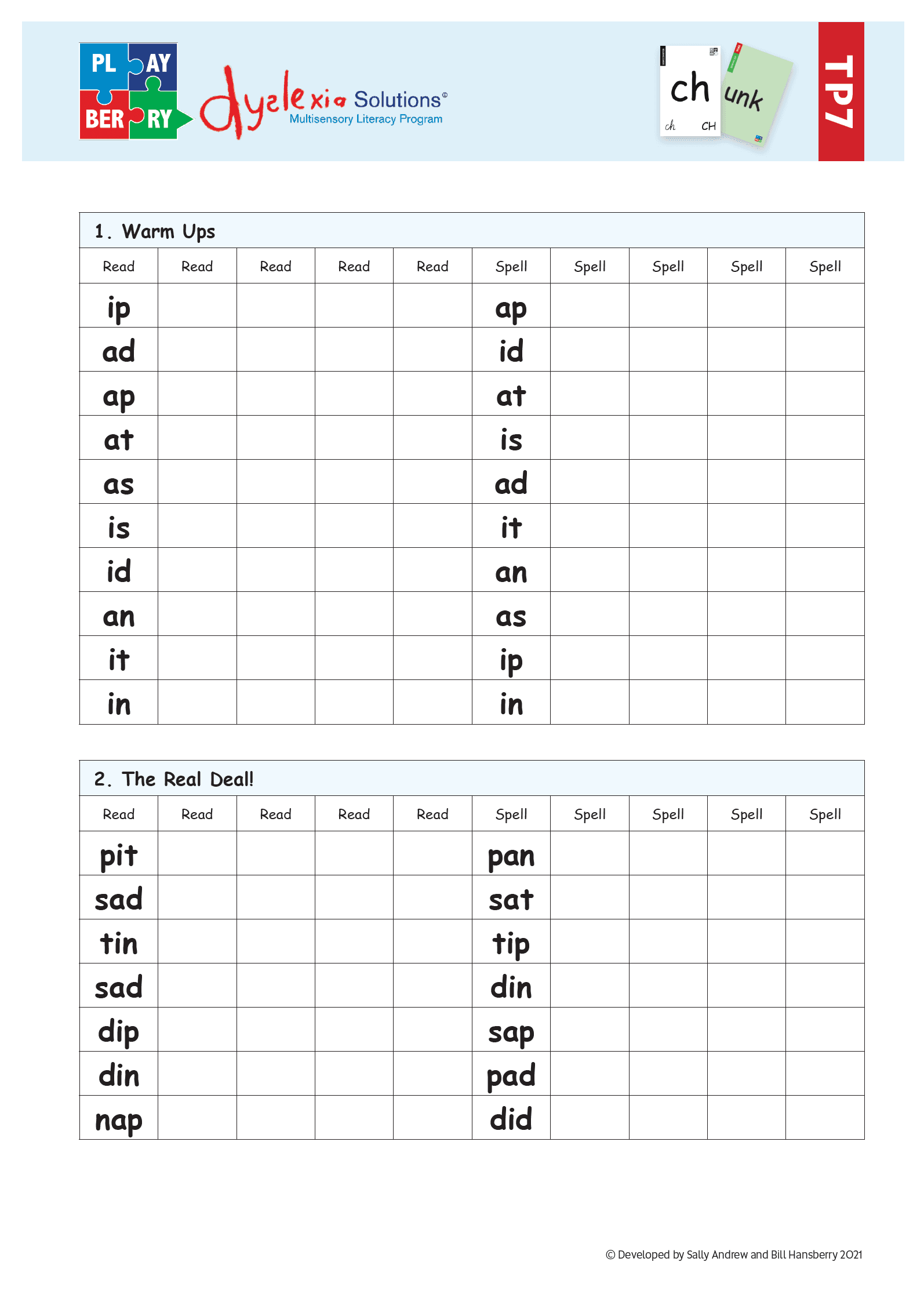 The Playberry T3 Chunk Sheet Exercises can be used periodically in the place of reading and spelling card drills and benefit students experiencing sound blending difficulties or spelling problems. The Playberry T3 Chunks are either whole words or parts of words. Many chunks are rime units. All of the chunks are to Playberry T3 structure up to the teaching point (TP) indicated at the top right of the page. To use the Playberry T3 Chunk Sheet Exercises, select a TP that is suitable for your student. This may be at, or behind, their teaching point.