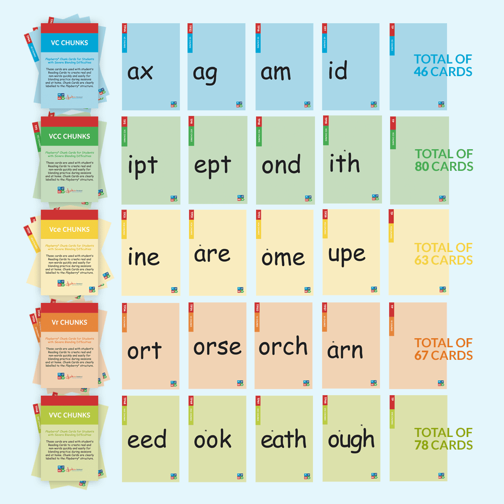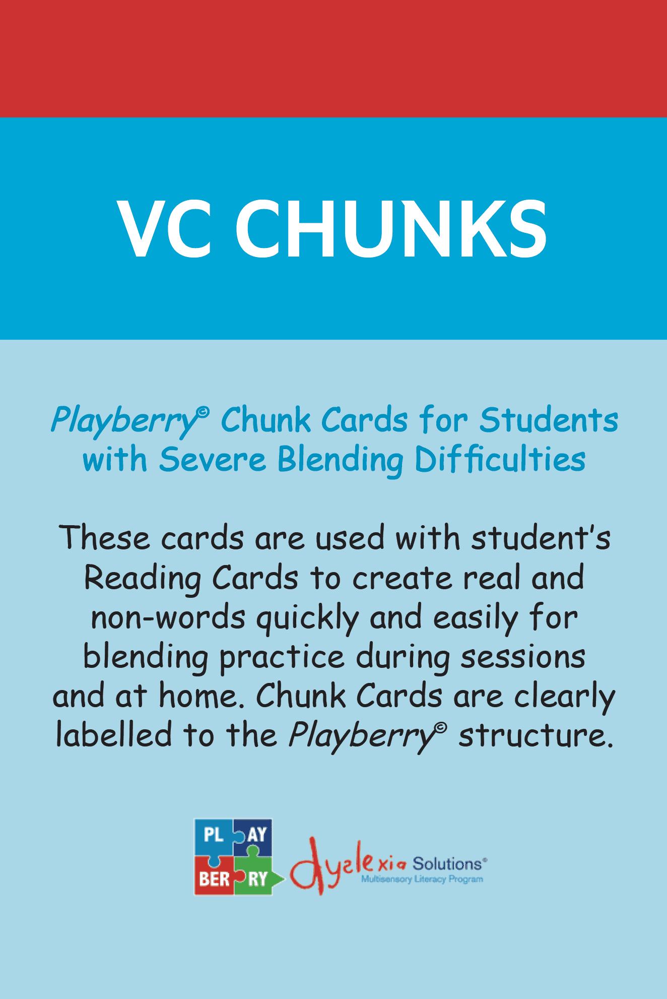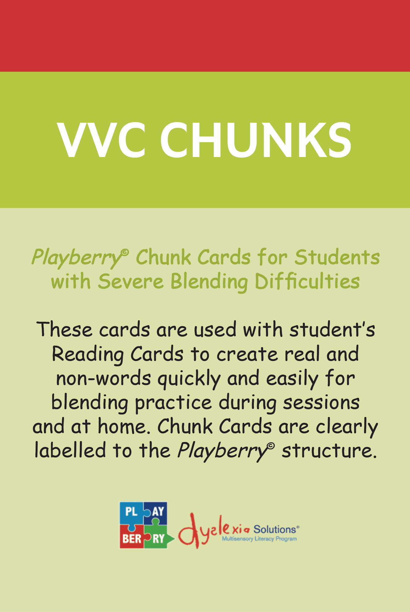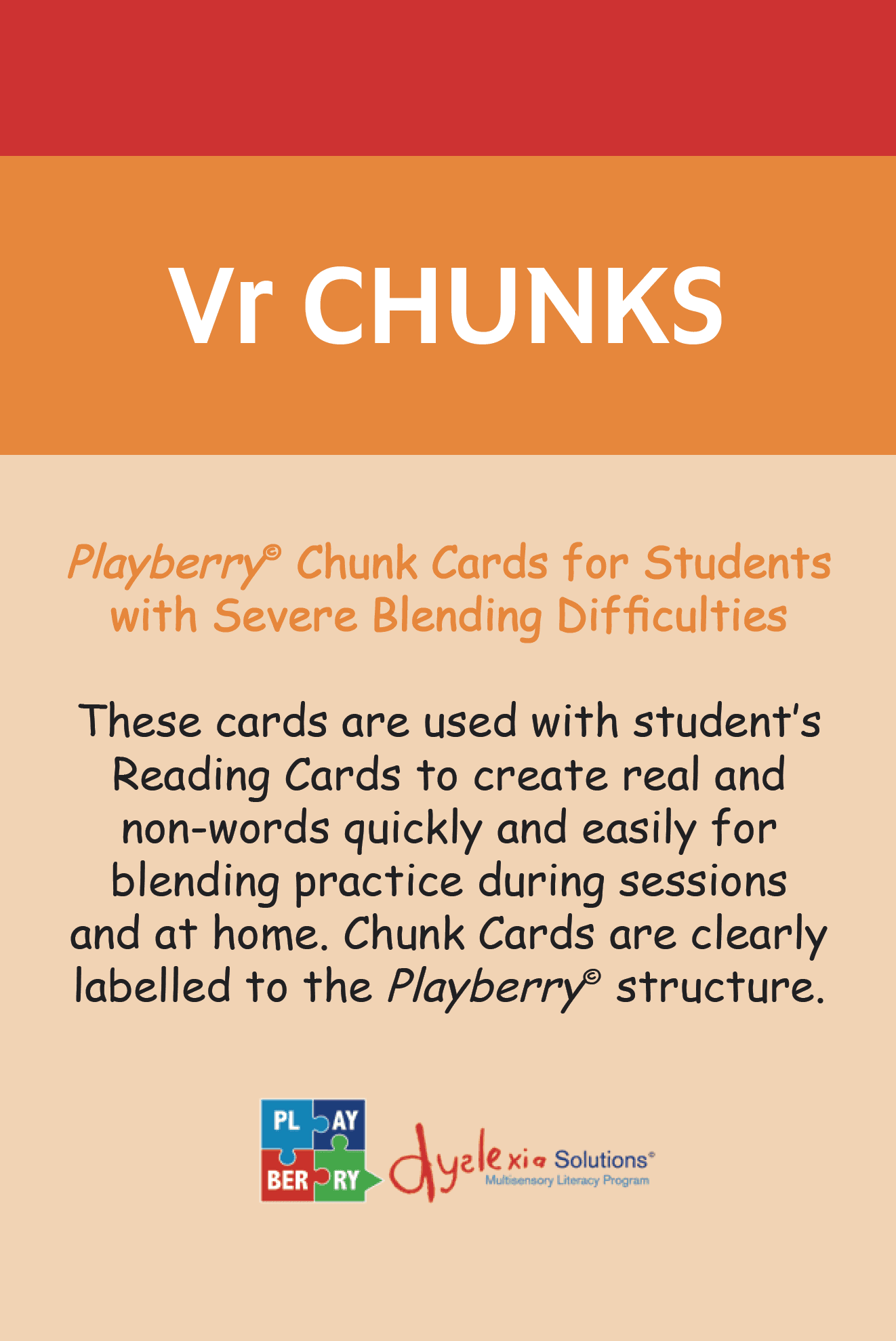 Playberry T3 Chunk Cards contain packs of VC, VCC, VCe, Vr and VVC chunks (333 cards in total). These cards are used with student’s Playberry T3 Student Reading Cards to create real and non-words quickly and easily for blending practice during sessions and at home.